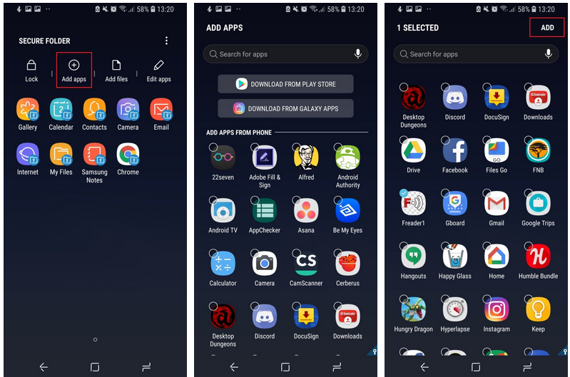 Avvia Samsung Sicuro Cartella > fai clic su “Aggiungi app“> scegli le app dall’elenco o puoi cercare nella casella di ricerca> fai clic su Aggiungi opzione per terminare.